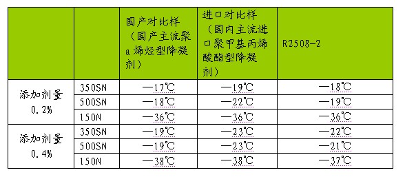 一般对于II类基础油,R2508-2添加0.3%时,即可以降低倾点18度。